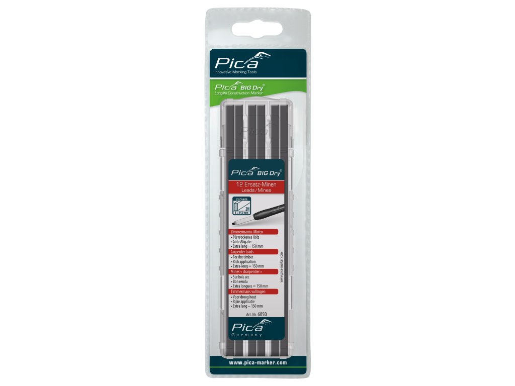 Náhradní tuhy hranaté pro tesařskou tužku Pika BIG Dry černé s tvrdostí tuhy 2H vhodné pro tesaře a truhláře.